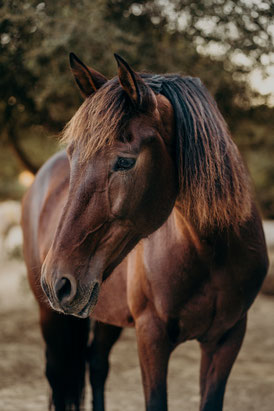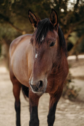 Die hübsche braune Stute Valerosa kam im Dezember 2018 komplett roh zu uns auf die Finca. 2019 haben wir mit ihrer Ausbildung zum Ausreitpferd begonnen und seit Ende 2020 geht Valerosa mit fortgeschrittenen Reitern ins Gelände. Valerosa ist eine kraftvolle Stute, die im Gelände gerne vorwärts geht und sehr angenehme Gänge hat. Sie braucht eine ruhige und feine Hand und einen ausbalancierten Sitz.
